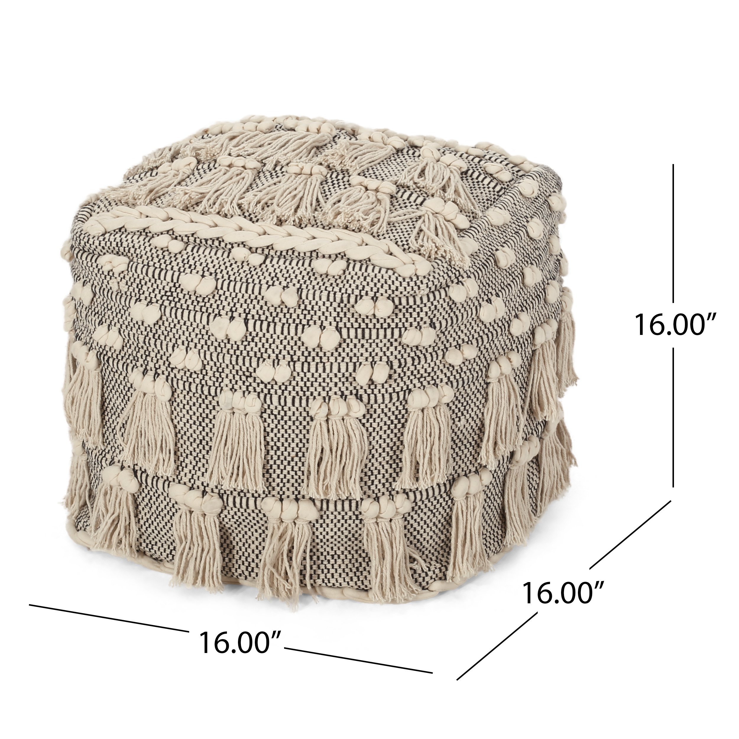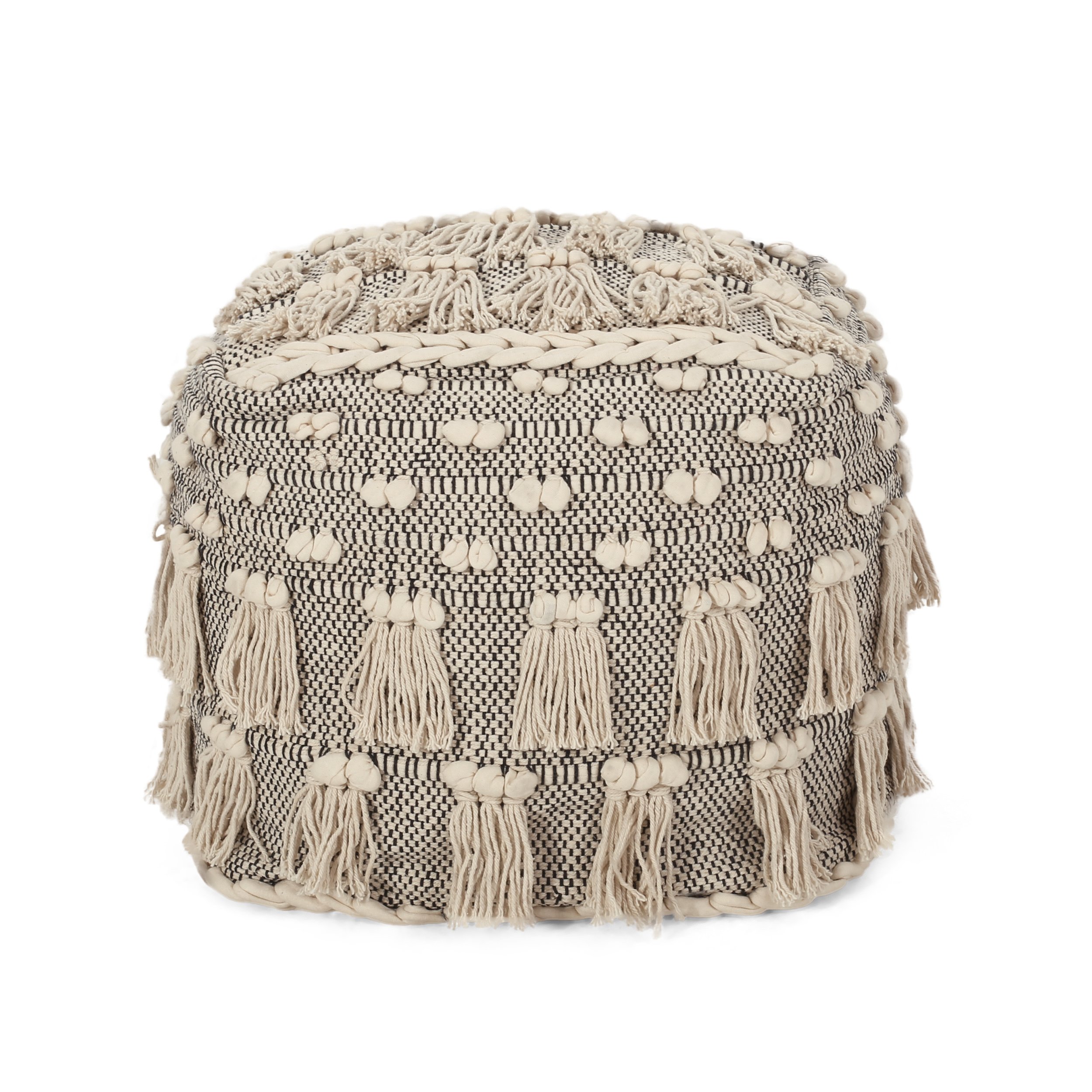 Angelic Handcrafted Fabric Pouf with Tassels, Ivory