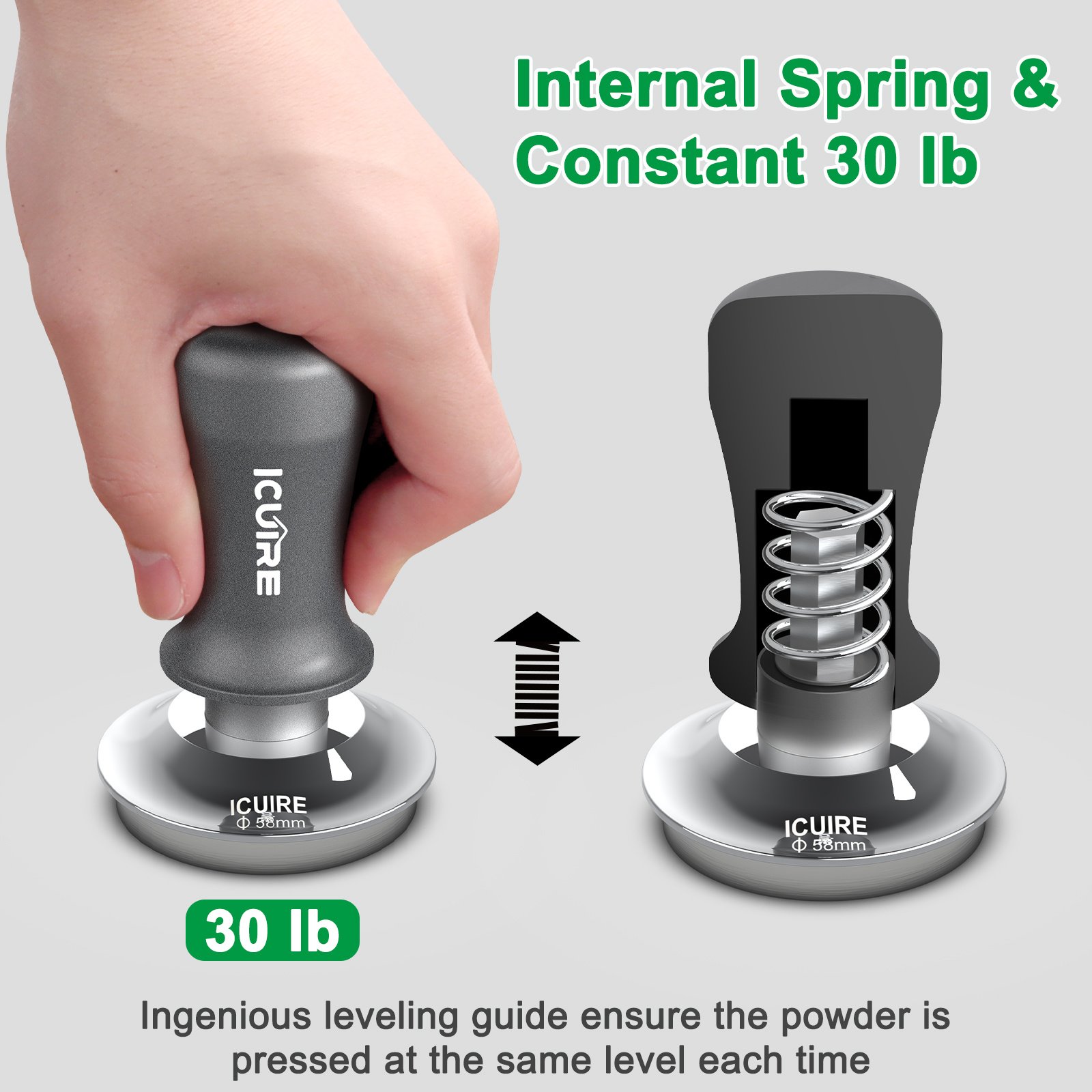 1.Circular Baffle Design - Ensures that the coffee powder is pressed at a uniform height every time, and avoids the non-vertical force causing the coffee puck surface to tilt. Suitable for novices. ICUIRE coffee tamper provides an optimal mashing force of 30 lbs.